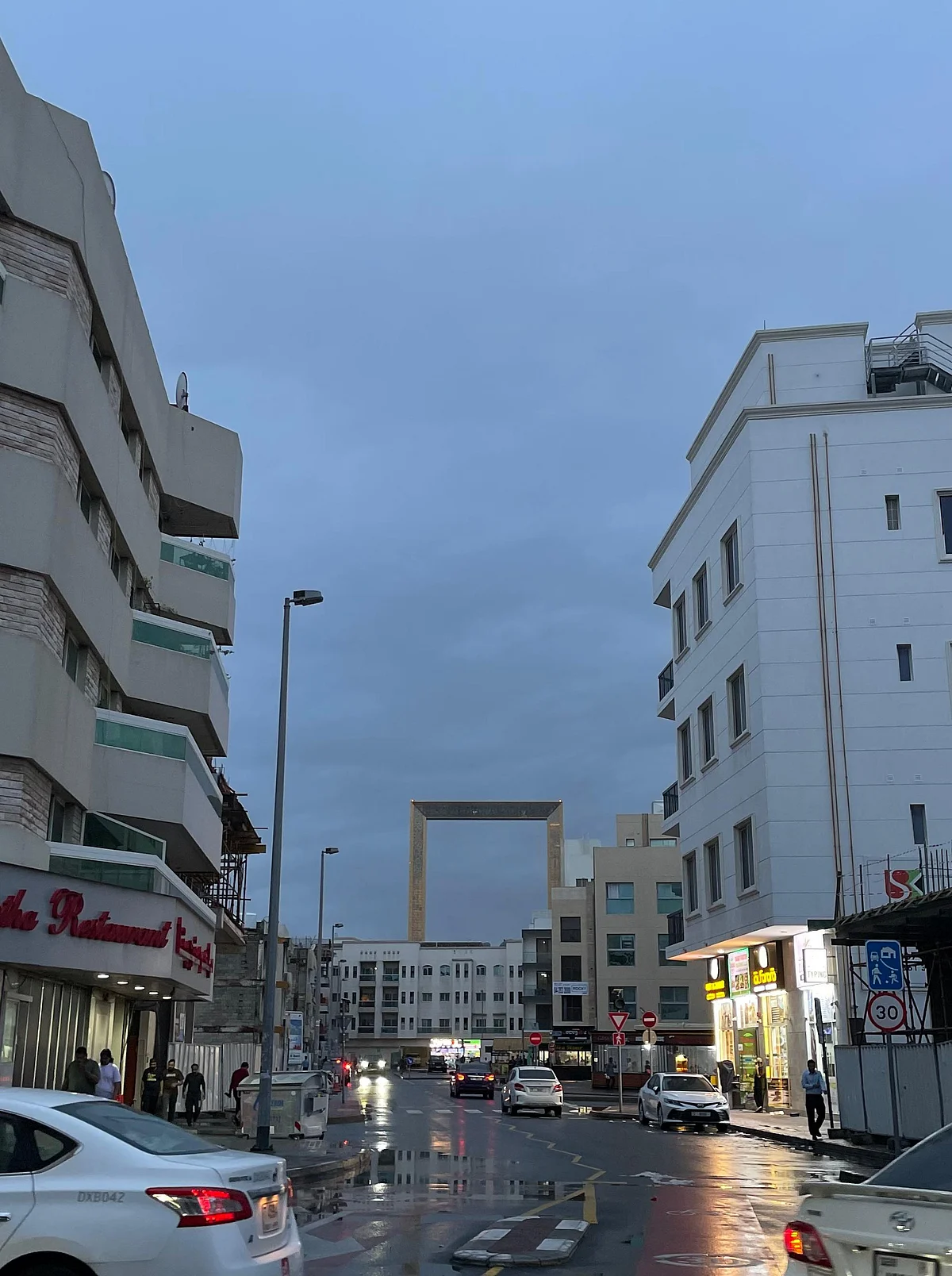 In a photo shared by Khaleej Times' Thanweeruddin Mohammad, the sky remains heavy and grey, a soft blanket of clouds hanging over the city, yet the Dubai Frame stands tall and resilient in the background.