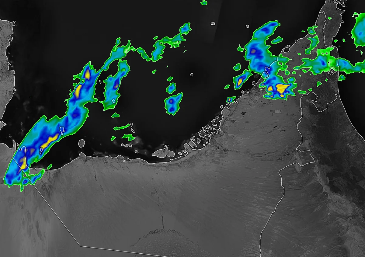 Cell activity is organised into two distinct corridors, an elongated band of heavy cells tracking across the central and western Gulf, and a cluster of intense storms hovering over the Northern Emirates and Musandam coastline to the northeast.