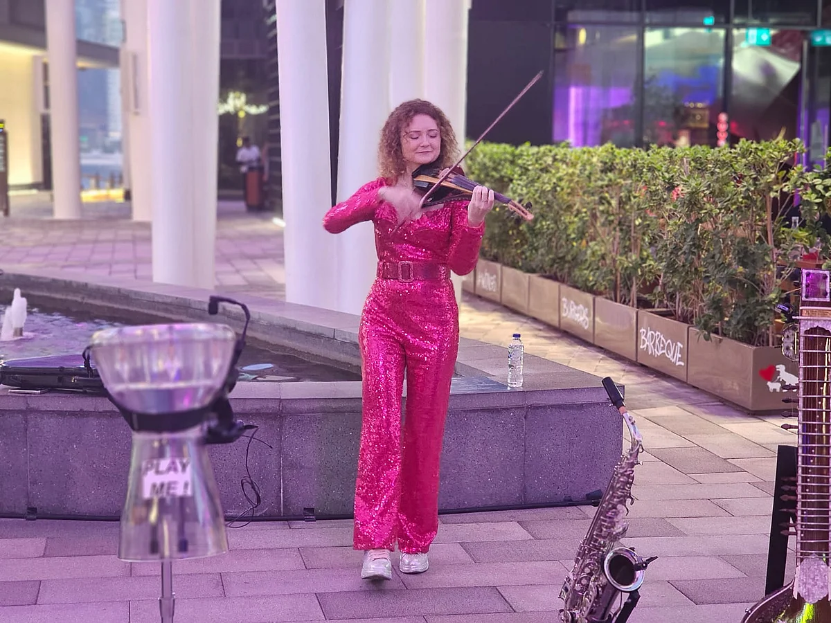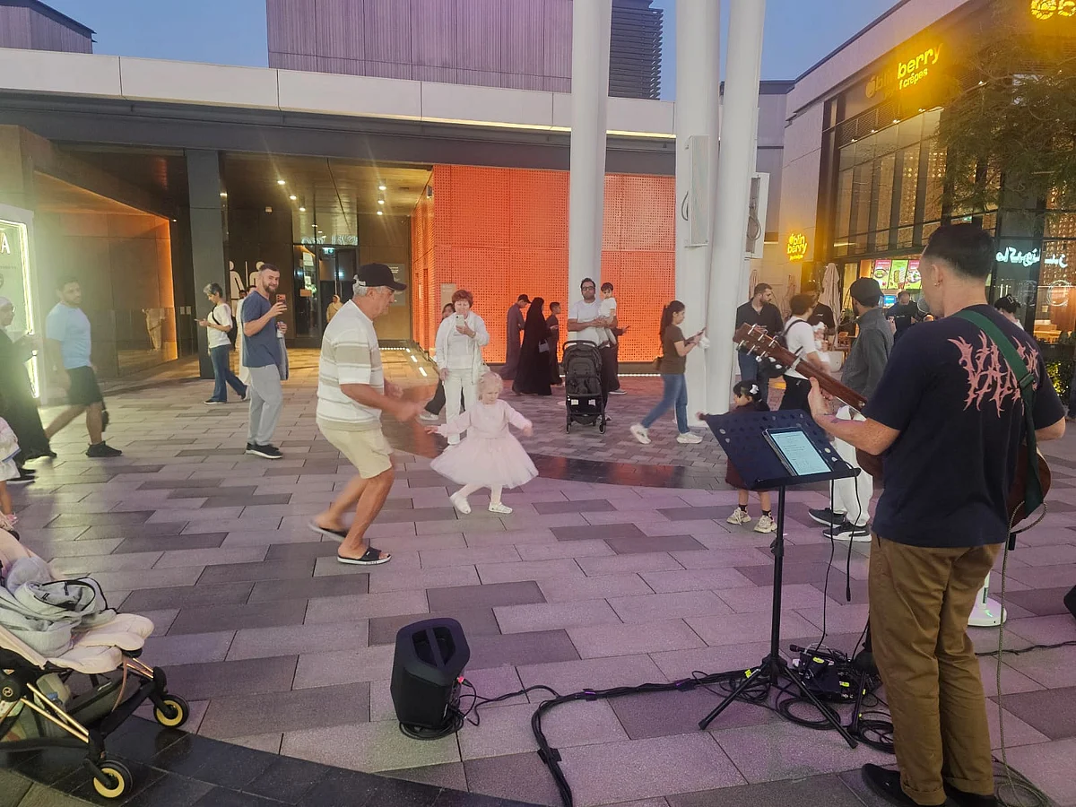 Visitors to Bluewaters Island are in for a treat on weekends. As the sky turns dark, the waterfront transforms into a lively open-air stage where international artists perform just a few steps away from the crowd and completely free of cost.From 6.30pm to 10.30pm every Friday, Saturday and Sunday, four performances take place at the same time across different spots on the island. In total, 25 artists are part of the Dubai Busking Experience, bringing singing, dance, circus acts, magic and live instrumental music to the promenade.Instead of simply walking past restaurants and cafes, families stop midway. Children sit on the ground and sometimes dance go the tunes. Phones go up to record the moment. What begins as a casual stroll quickly turns into an unexpected show.Stay up to date with the latest news. Follow KT on WhatsApp Channels.A grandfather and his granddaughter share a joyful dance as UK artist Michael performsOne of the biggest crowd-pullers is Salina Bakaou, a full-time performance artist whose hula hoop act had dozens gathered. With multiple hoops spinning effortlessly around her body, she mixes humour, audience interaction and spontaneity into her performance. At one point, she pulls a volunteer from the crowd. A few minutes later, applause fills the air.“I am 100 per cent an artist. I have fully committed to this and I do nothing else,” said Salina.She describes herself as a jack-of-all-trades. Apart from hula hooping, she performs fire acts, contact juggling, singing and hosting. “What makes my show different is not just skill but emotion,” said Salina.“There are so many skilled performers out there. What I bring is soul and character. I make you feel something. No two shows are ever the same.”For her, performing at Bluewaters is special. “This is the first time busking is allowed here, and I am insanely excited. It’s been on my bucket list for so long. People just want an excuse to play,” added Salina. Watch her perform below:A short walk away, musician and magician Adam Cadabra creates a completely different atmosphere. Sitting with his guitar placed flat across his lap, he plays in a style called lap tapping. The sound is rhythmic, almost hypnotic, and slowly draws people closer.“The style I play is called lap tapping,” said Adam. “It came from early blues slide guitar, but I use an open F tuning. I actually discovered it after I broke my hand in an accident and couldn’t play normally. I tried this method, and it slowly grew into what you see today.” Watch his performance below:Adam started as a street magician in the UK nearly ten years ago. “This is how I began. Walking up to people, doing tricks and hoping they would like it at the end,” he said.“Dubai is different because you are paid here, but it’s exciting to see this culture starting.”The Dubai Busking Experience brought together performers from different parts of the world. With four shows happening simultaneously, visitors can move from one act to another, from a soulful singer to a circus-style performance, from magic tricks to live dancers.A violinist entertains visitors with a live performanceThere are no tickets, no barriers and no formal stage separating artists from the audience. The interaction is direct and natural. Visitors can also support performers through a secure cashless payment option.Running until March 1, Bluewaters is no longer just about dining or views for the visitors. On weekends, it has become a space where art meets the public, and entertains them for free.How Dubai's nightlife is expanding to include families, day-time beach activitiesDubai Fountain show to Flag Garden: 5 free events to catch before they end