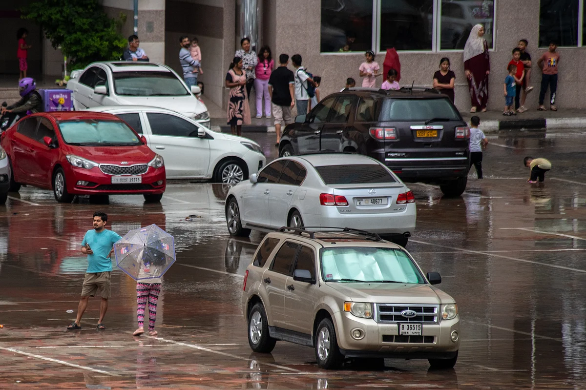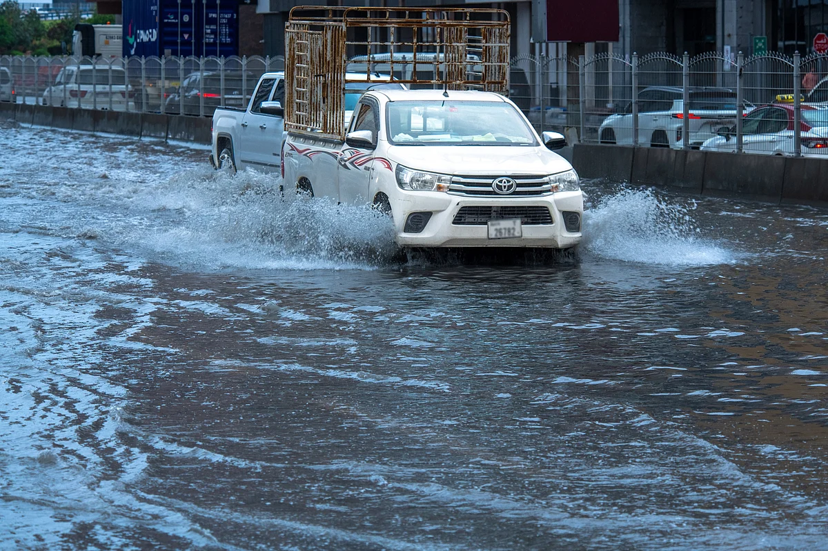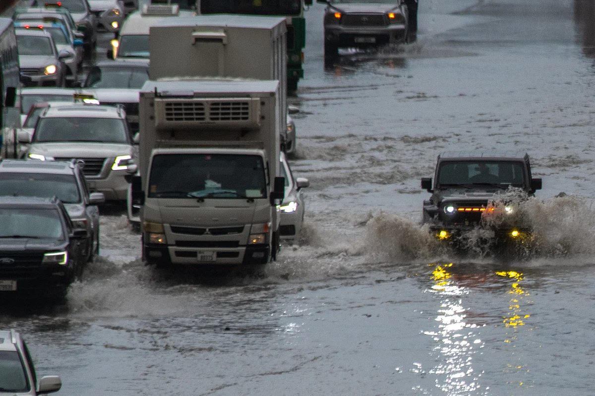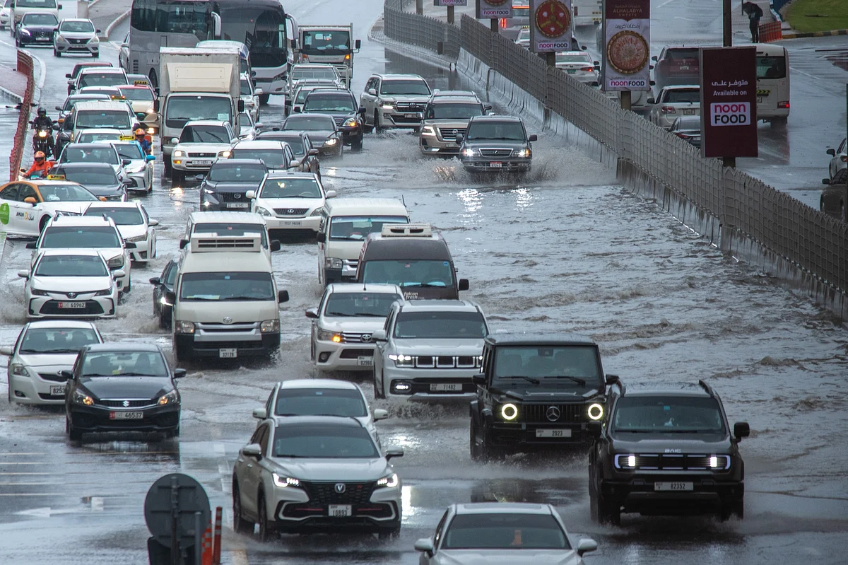Drivers in Sharjah maneuver through the heavy rain, their vehicles leaving ripples in the flooded streets