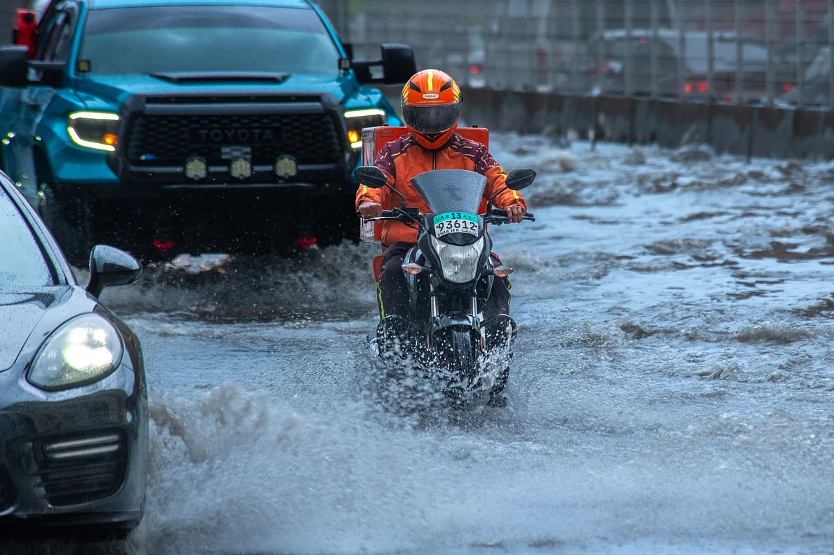 A delivery rider in Sharjah weaves carefully through the pouring rain, determined to reach customers despite the rains