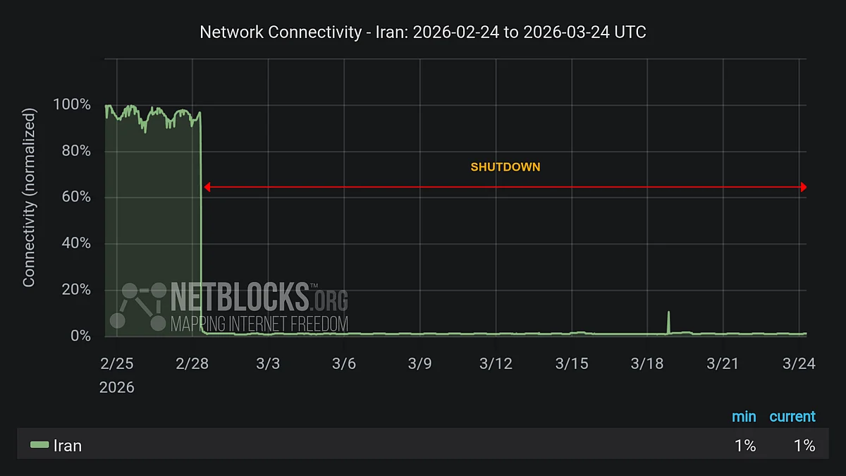 Iran's ongoing internet blackout has now entered its 25th day, marking more than 576 hours of restricted global connectivity, according to monitoring group NetBlocks.