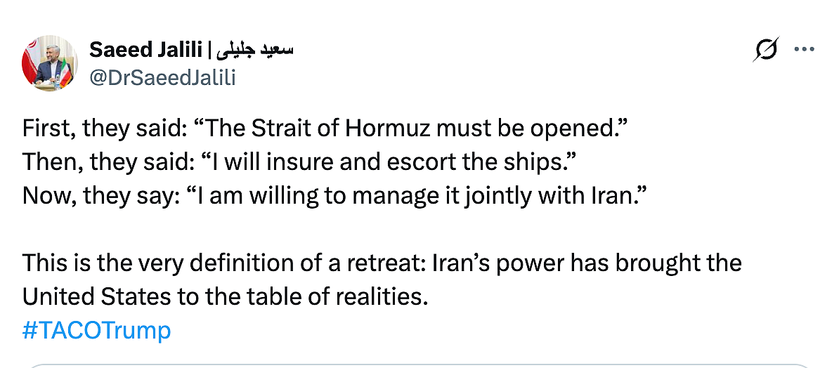 Jalili described Trump's move as a US “retreat” on the Strait of Hormuz and suggested that the reported postponement reflected shifting US decision making.