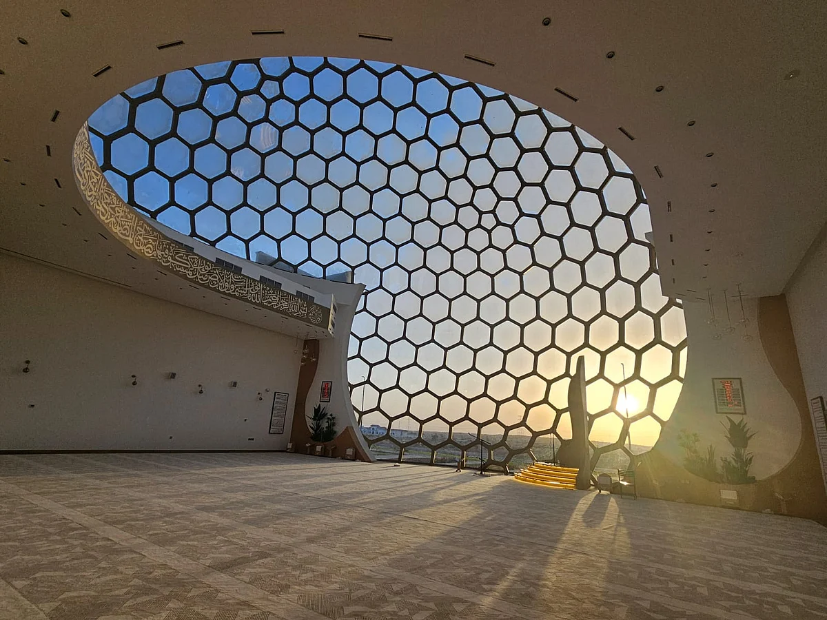 As the sun sets over Al Dhaid, the inside of newly opened Al Nasr Mosque begins to glow. Golden light pours through a giant round glass dome made of small hexagon-shaped glass panels, and the prayer hall fills with warmth and calm sunlight. For a few minutes, it feels as if the mosque is made of light.