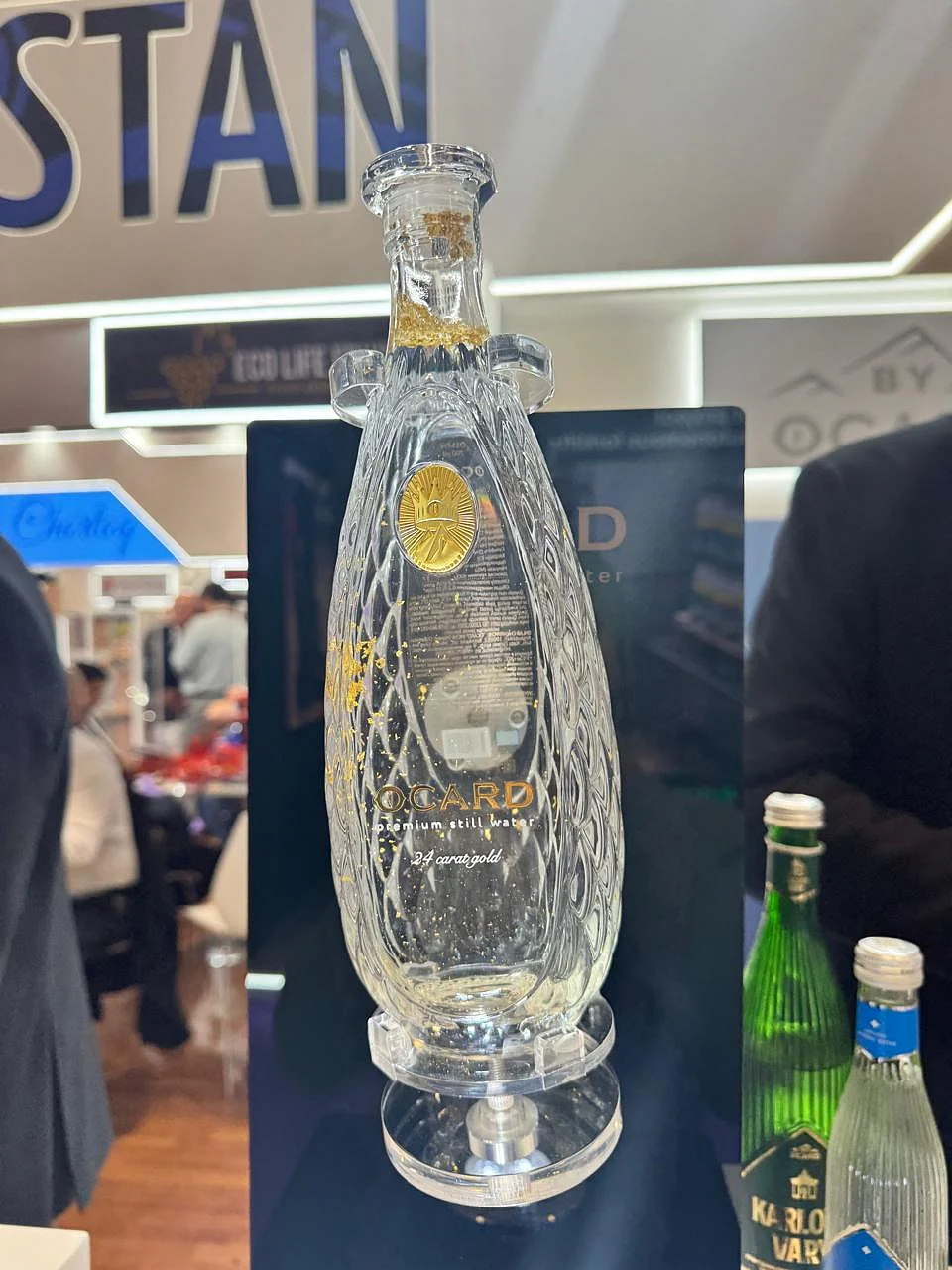 Now hydrate in style! The brand Ocard is exhibiting an exclusive, premium mineral water with authentic 24-karat gold flakes in it. The Uzbekistan-based company produces the unique product at one of the oldest gold mining plants in Europe. At its stand at Gulfood, the bottle was displayed on a rotating stand to keep the gold flakes floating. A spokesperson said the water bottle had both number 3 and number 5 flakes and retails in the US for approximately Dh360 per bottle.